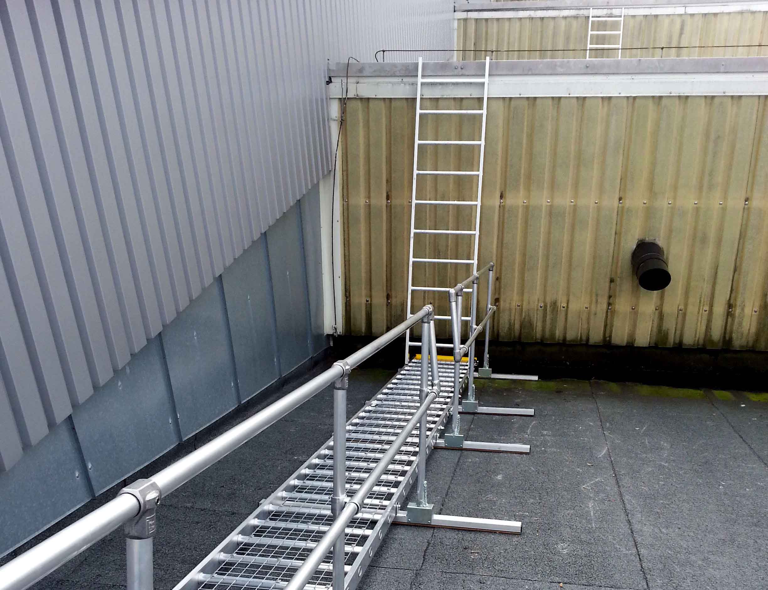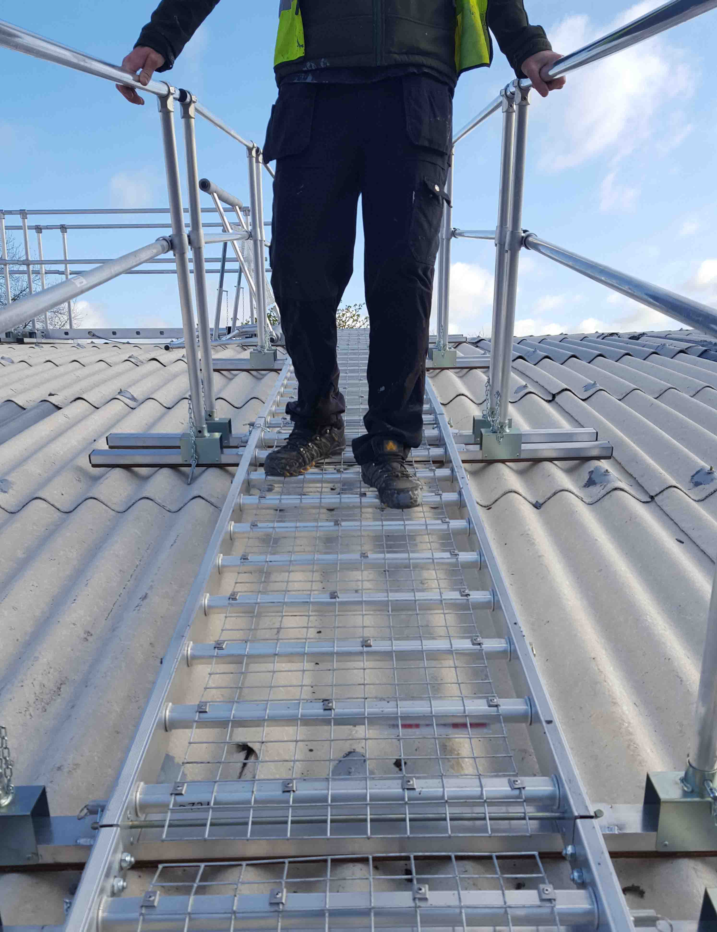 Roof-Walk is a fully guarded rolling work platform mounted on twin tracks to enable you to move up and down the roof. The standard length platform is 4.6m and runs up and down twin modular 4m linking track sections that are fitted with safety mesh and support battens.